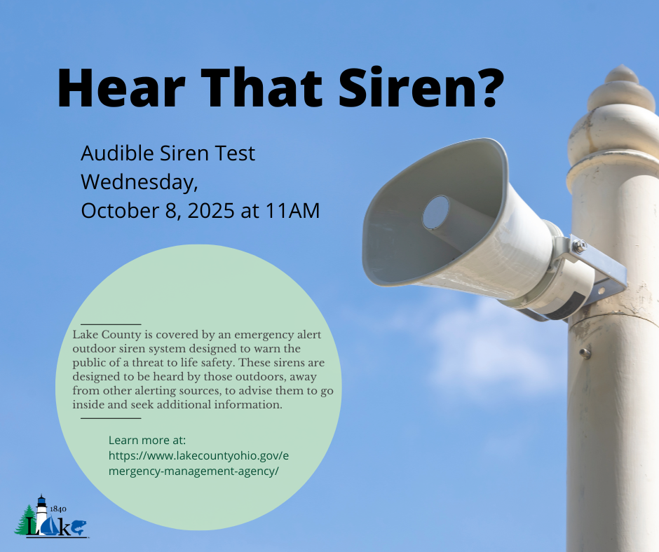 The Lake County EMA will be testing their emergency siren tomorrow, Wednesday, October 8, 2025, at 11 a.m. This is only a test. Please do not call 911 unless you are experiencing an emergency. https://www.lakecountyohio.gov/emergency-management-agency/