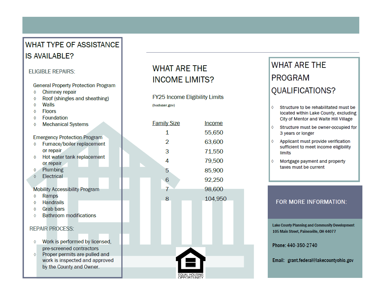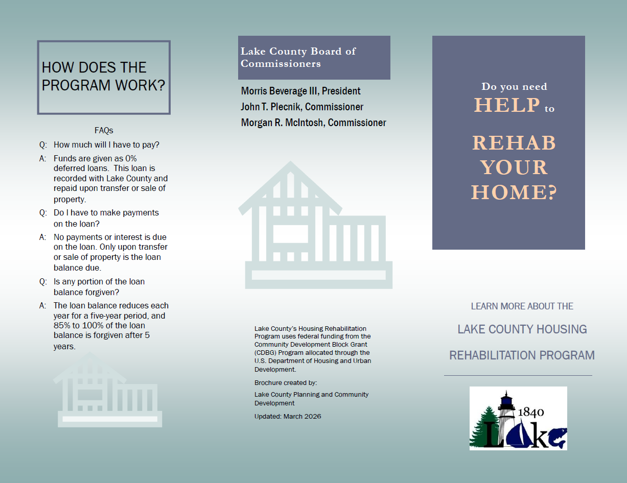 The Lake County Housing Rehabilitation Program is designed to improve the housing conditions for income eligible families and extend the economic life of housing stock through three types of assistance: Emergency Repairs, Mobility and Accessibility Repairs and Modifications, and Full Single-Family Homes Rehabilitation. The Program provides assistance through grants and loans. Work is performed by licensed, pre-screened contractors.