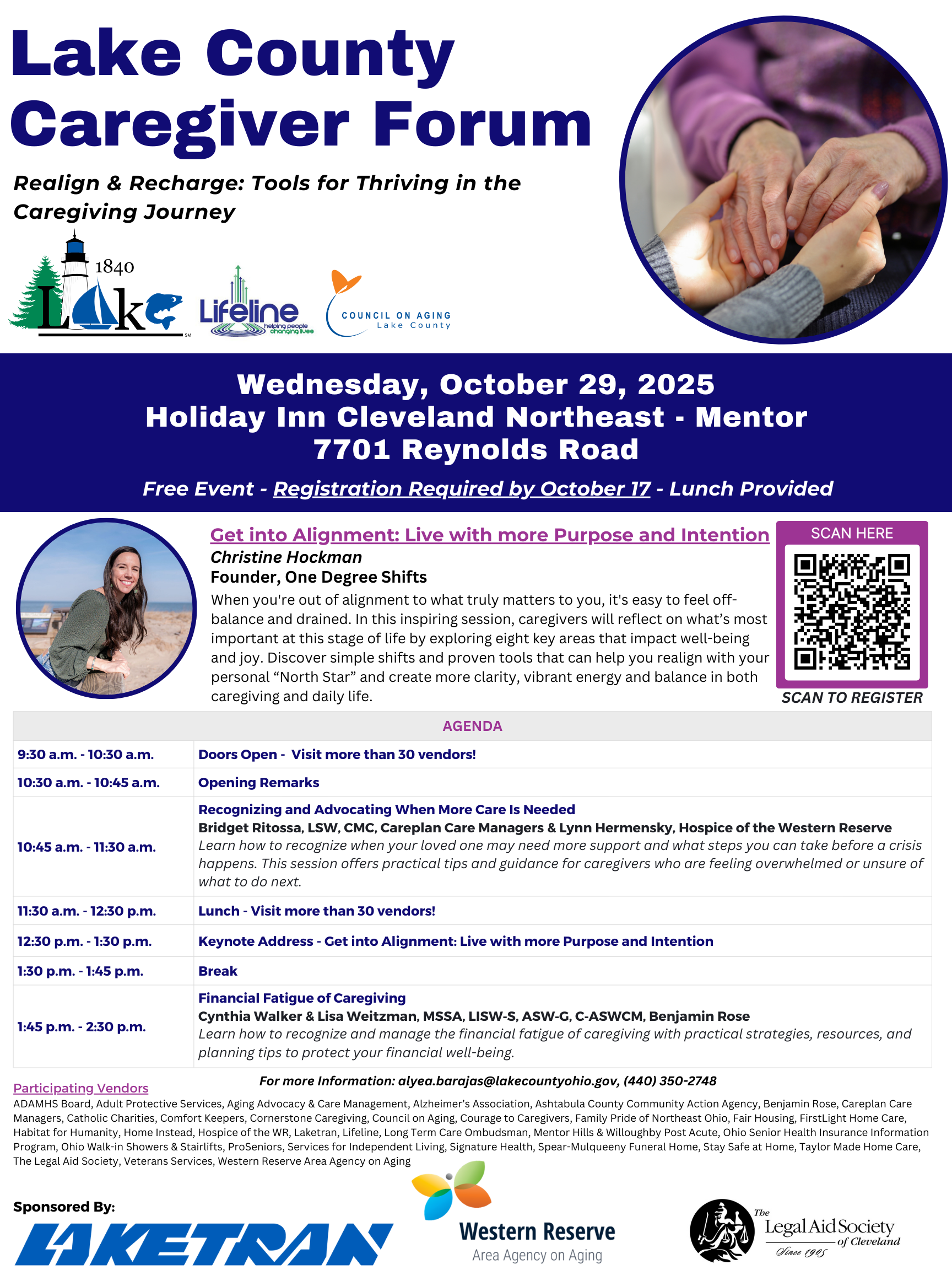 The 2025 Lake County Caregiver Forum has reached full capacity. To be added to the wait list, please contact us at (440) 350-2748.